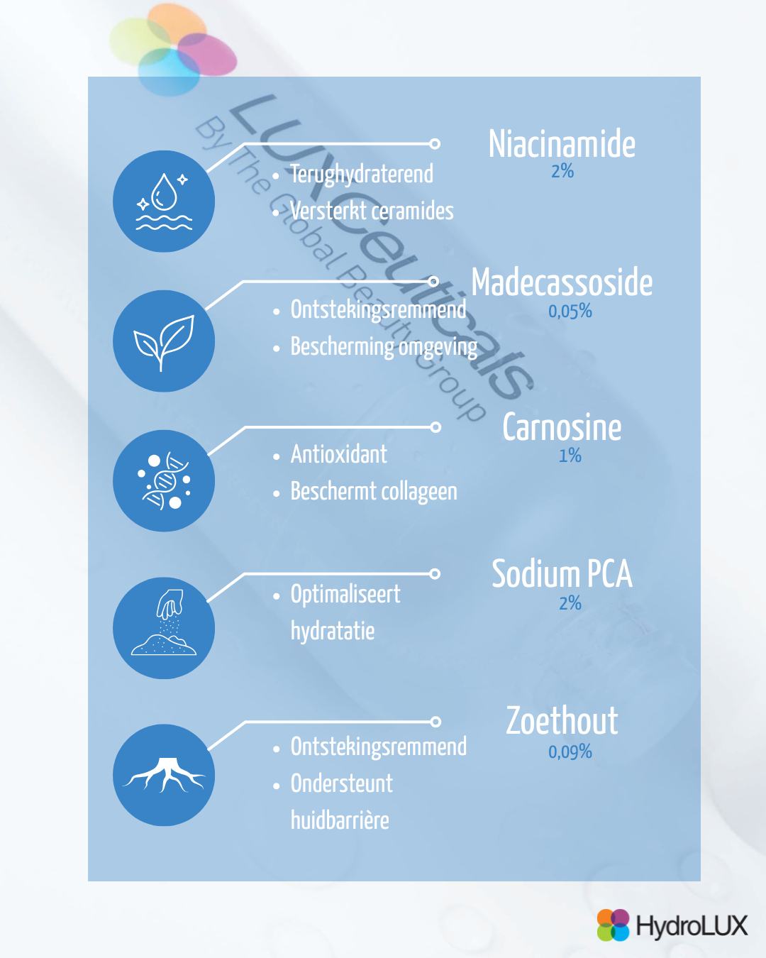 LUXCeuticals bestaat uit een reeks doelgerichte serums die speciaal ontwikkeld zijn voor het HydroLUX-toestel. Deze infusies dringen diep de huid in tijdens een hydradermabrasie-behandeling waarna ze actief werken op specifieke huidbehoeften.